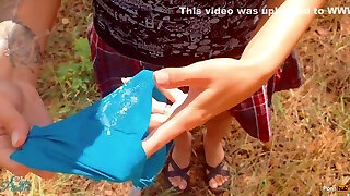 Dirty panties after pissing Cougar outdoors turns her boy on