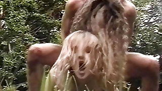 Two horny chicks nailing with a stranger in the nature