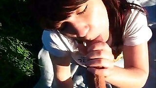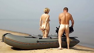 Nude MILF with xxl rump is into sucking her hubby on the beach